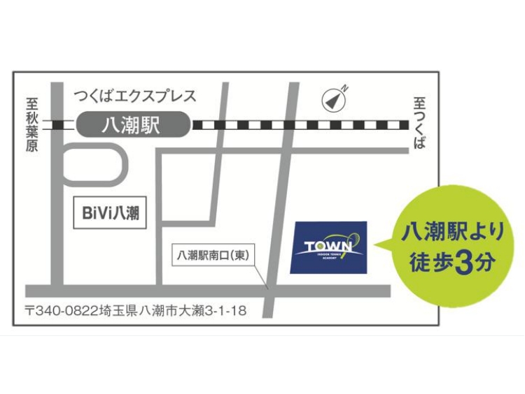 タウンインドアテニスアカデミー八潮駅前校は、初心者から経験者まで誰もが楽しめる、八潮駅から徒歩3分のインドアテニススクール。